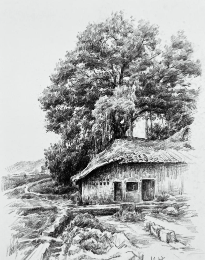 素描风景,其实是一种关于“看”与“不看”的修行。清晨推开窗,远山被雾气轻轻揉皱,近处的老槐把影子投进未干的石板上,像一枚被岁月遗忘的印章——这满当当的世界,若一笔不落,只会沦为琐碎的复写;若一窍不通,又只剩空洞的符号。于是,画家像一位沉默的编辑,在浩大的自然原稿里删繁就简,把风声、鸟啼、雾气与心跳,一并压进一张薄纸的经纬。取舍的刀锋从此落下:留一座山脊的傲骨,弃整片灌木的絮叨;留一条河湾的婉转,弃无数卵石的争吵。大景可纳千里,小景可藏一芥,关键在于让“看见”与“看不见”同时发声,让空白处长出回声。正如中国画论里那句“计白当黑”,素描亦如此:空白不是缺席,而是让光线、空气与想象得以通行的回廊;黑灰不是终点,而是为山水铸魂的锚点。于是,一方小小画幅,便拥有了“可游可居”的辽阔,也拥有了“一花一世界”的幽深。