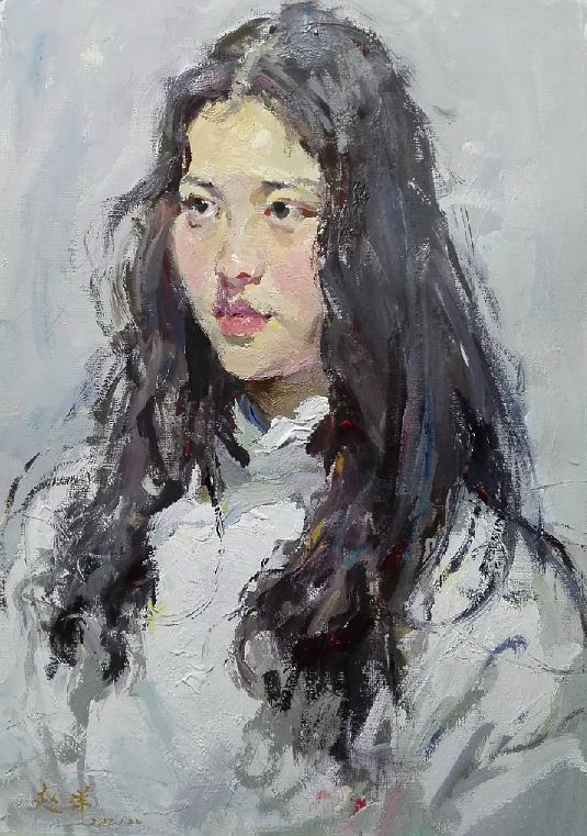 无论是人物暗部的深色还是受光部的亮色,尤其是受光部的亮色,第一笔或第一块颜色摆t画面时要力求准确,不能随意和马虎,因为我们在画面上所表现的是写生的人物与环境中的物体各个部位相互之间的色彩变化关系,而每次新摆上去的颜色都是以先摆上画面的颜色作为依据和标准进行比较来衡量它们之间色彩关系是否准确。如果最先摆上画面的颜色不准确,那以后摆上的颜色就会随先上之色的偏差而出现偏差,假如先画的颜色偏暖,以后逐步画上去的颜色必然会跟着偏暖,同样道理,先画之色偏冷、偏灰或偏艳,以后画上之色也随着偏冷、偏灰或偏艳,而画面色调也会随之而偏冷、偏灰或偏艳。