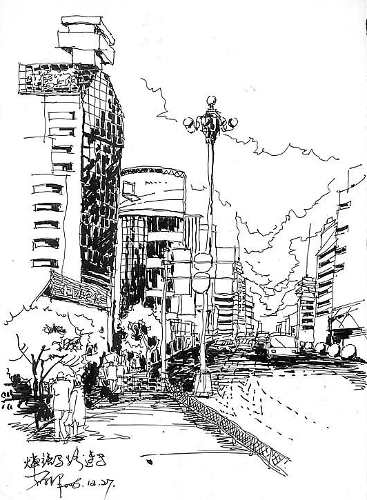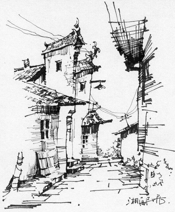 一般情况下,一幅风景速写的构图是需要有多种多样的物体组合而成的。这些物体以其显性的形态呈现在画面中,这些形态有些是有某种关联的,而有些表面上没有任何关联。我们必须将这些形态构成一组具有一定整体性,又具有一定美感的,传递着一种我们所需要表达的信息的整体形象,这便是构图的要求。具体地分析,我们可以将构图的形式概括地分成简单的几何形态,如方形、圆形、三角形、菱形、弧形、S型、梯形、对角形等等形式。所有这些几何形,都是我们用最简单的形式归纳构图的一般形态,以便于我们把握构图的对称、均衡、统一、对比等关系,这就是构图的基本原则。认真领会和把握对称、均衡、统一、对比等形式法则,使我们在画速写时强调某些部分,弱化某些部分或删除某些部分,以凸显或创造出画面的趣味中心。整合、归纳、提炼、强调是构图表现的必然,因为我们不可能无一遗漏地在纸面上表现出景物的所有细部,只要我们认真观察一下我们周围的景物,我们将会发现,这些景物是由无数细小的东西所组成的,越仔细观察越是无法穷尽。所以,整合、概括、归纳、统一是构图与速写表现中必须的工作。