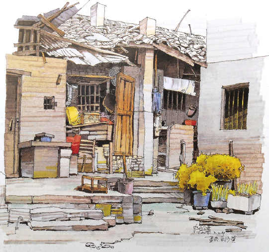 色彩的运用更是令人赞叹,马克笔的鲜艳色彩在这里得到了充分的发挥,不同的色彩搭配和渲染技法,巧妙地表现出光影的变化以及不同材质的质感。细节之处,如砖石纹理、玻璃反射、门窗框架等,都处理得细腻入微,显示了作者对建筑细节的深入观察和精心描绘。