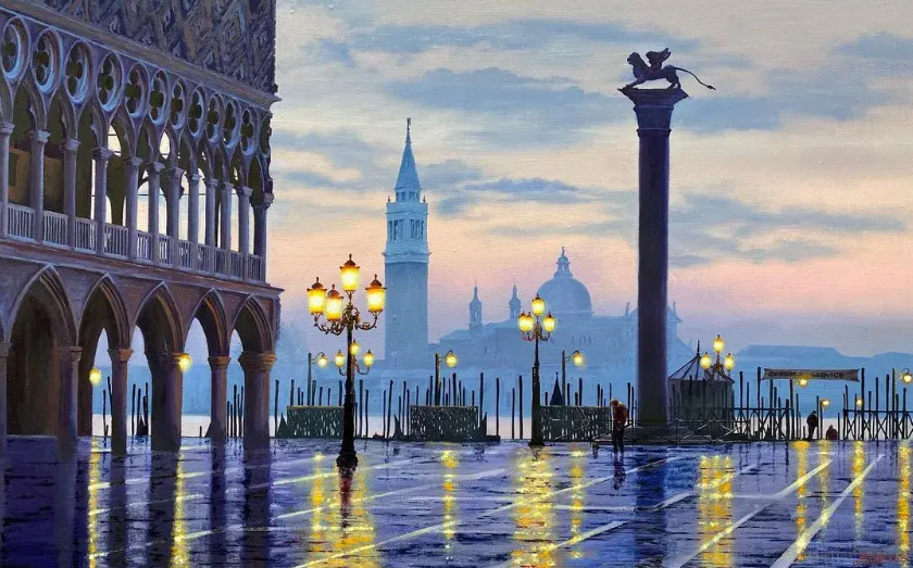 细心观察可以看到,画家在技法上的变化,比如,同样是楼房,画家在描绘远景建筑物时特意将笔触和水痕隐去,使得石墙石柱充满质感,而在渲染小巷子的气氛时,则使用了特殊技法,使得墙面充满斑驳的岁月痕迹,充满展现出了水彩技法的可塑性。