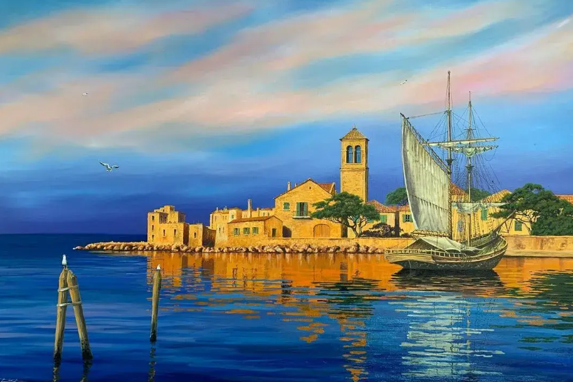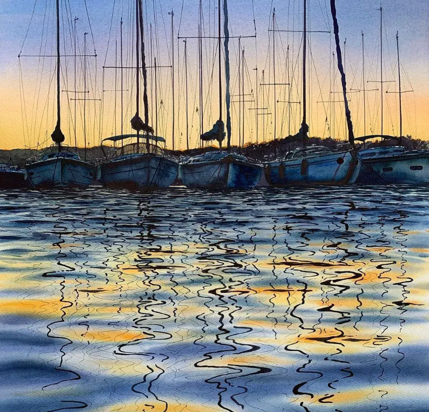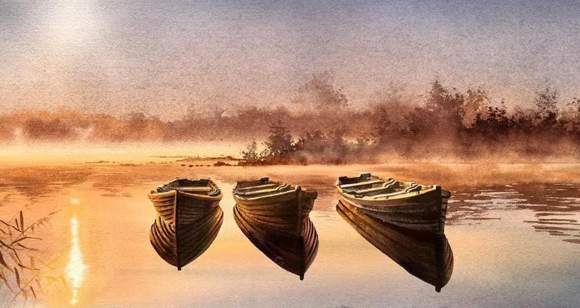 天空虚无缥缈,近处水波纹则干脆锋利,这样的对比是水彩画的拿手好戏。