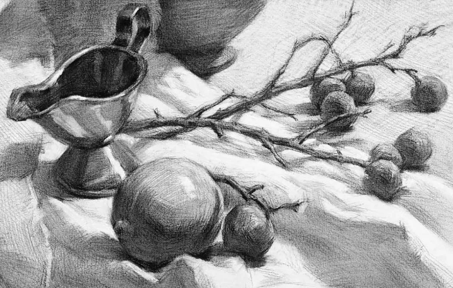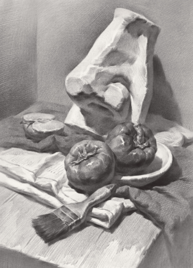 素描是“单色”绘画,因此,在素描造型中,物象的色彩感只能依赖于不同物象色彩的明度差异来表现。即是说在静物写生中,准确判断在一定的光源、空间条件下,物象之间固有色的明度及其差异,是不同物象色彩感表现的惟一依据(图2)。