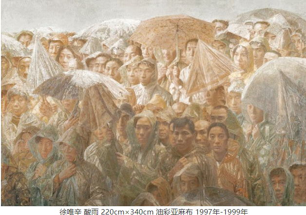 大型作品的构成是由特殊的规律性、题材内在的规定性和一定的偶发性几个方面的因素集合而成的,最后的形成因素十分复杂,画面的最后结果也难以预料。制作也是一个反复改动的过程。一般我在上画布前只是依照一个模糊的想法,并不固定画面。例如《酸雨》(220CMX340CM 1997-1999九届全国美展铜奖),这幅作品因为追求雨雾的效果,有意压缩了黑白关系,有很大的难度,制作时间长达两年。1997年构图开始的时候,只有中间部分,半年后,一边又加了一快,成为三联,面积增加了一倍,人物由原来的七八个增加到三十几个,变成了一个大型的作品。与开始的小稿比,面目全非。