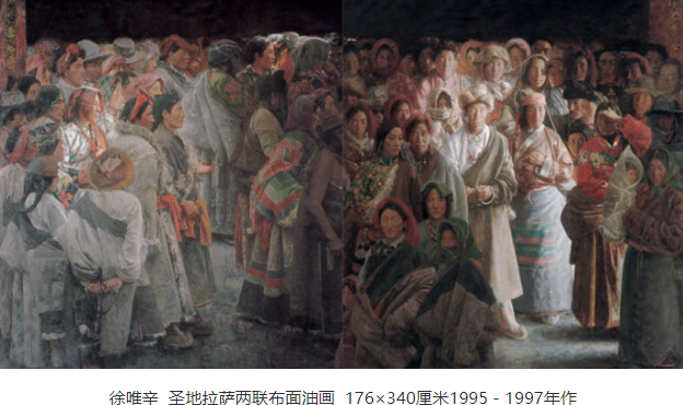 《圣地拉萨》 (180CMX340CM1995--1997)的创作也是如此,最开始的构图是两联,为了暗示朝拜队伍的环绕方向,与右联的正面的人群对应,左联所有的人物都是背部。但上了画布画到一定阶段以,就觉得别扭,只好把左边的三十多人全部改成了侧面。