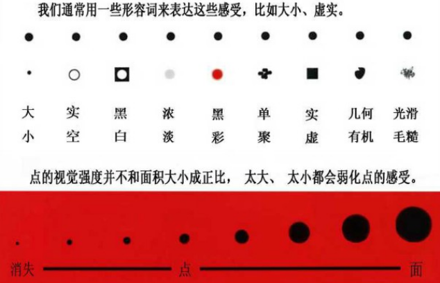 康定斯基对点的定义:“点可称为最小的基本形态,但是不能说这是正确的规定。因为‘最小的形态’的正确界限是难以划定的,点有时可以扩大成面。”