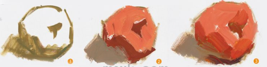 步骤二:用大色块铺出苹果的固有色和暗部,画出苹果的大致明暗关系。