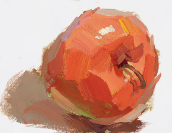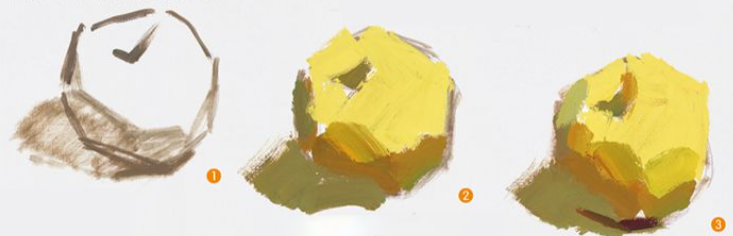 苹果形体为固中带方,最适宜用色块进行塑造。不过果蒂处的苹果窝凹陷下去,与苹果的大形形成圆弧形转折。表现苹果的难点在于亮部色彩的微妙变化和苹果窝体积关系的塑造。
