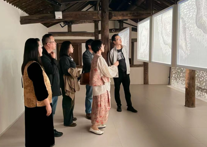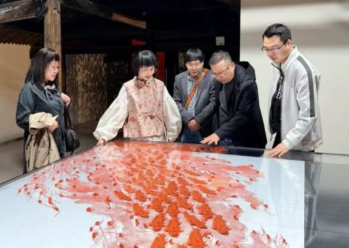 台绣作为国家级非物质文化遗产 “台州刺绣” 的核心传承基地,历经百年发展,已形成 “虚实乱针绣”“彩平绣” 等独特技艺风格,其作品兼具传统韵味与现代审美,多次亮相国内外重要艺术展会。当天上午,王谦老师走进位于葭沚老街的台绣非遗文化展厅,一幅幅精美的台绣作品即刻映入眼帘:既有展现江南水乡烟雨朦胧的风景画,也有刻画花鸟虫鱼灵动姿态的装饰画,更有将刺绣技艺与现代服饰融合的时尚设计,细腻的针脚、丰富的色彩与独特的构图,让在场者无不惊叹于非遗技艺的精湛魅力。
