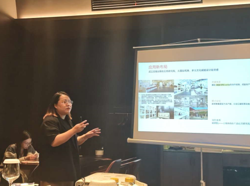 在互动研讨环节,双方围绕“材料真实性鉴别”“设计成本透明化”“工艺标准化落地”等核心议题展开热议。针对设计师关注的岩板应用问题,黎舒月现场回应:“通过岩板&锦砖产品应用研究院的技术储备,可提供从材料选型到特殊工艺实现的全链条支持,配合意大利莱米娜铺贴体系与自研无缝技术,破解大规格岩板落地难题。”王谦团队则从美学角度提出建议,希望在材料纹理设计中融入地域文化元素,增强空间设计的在地性。